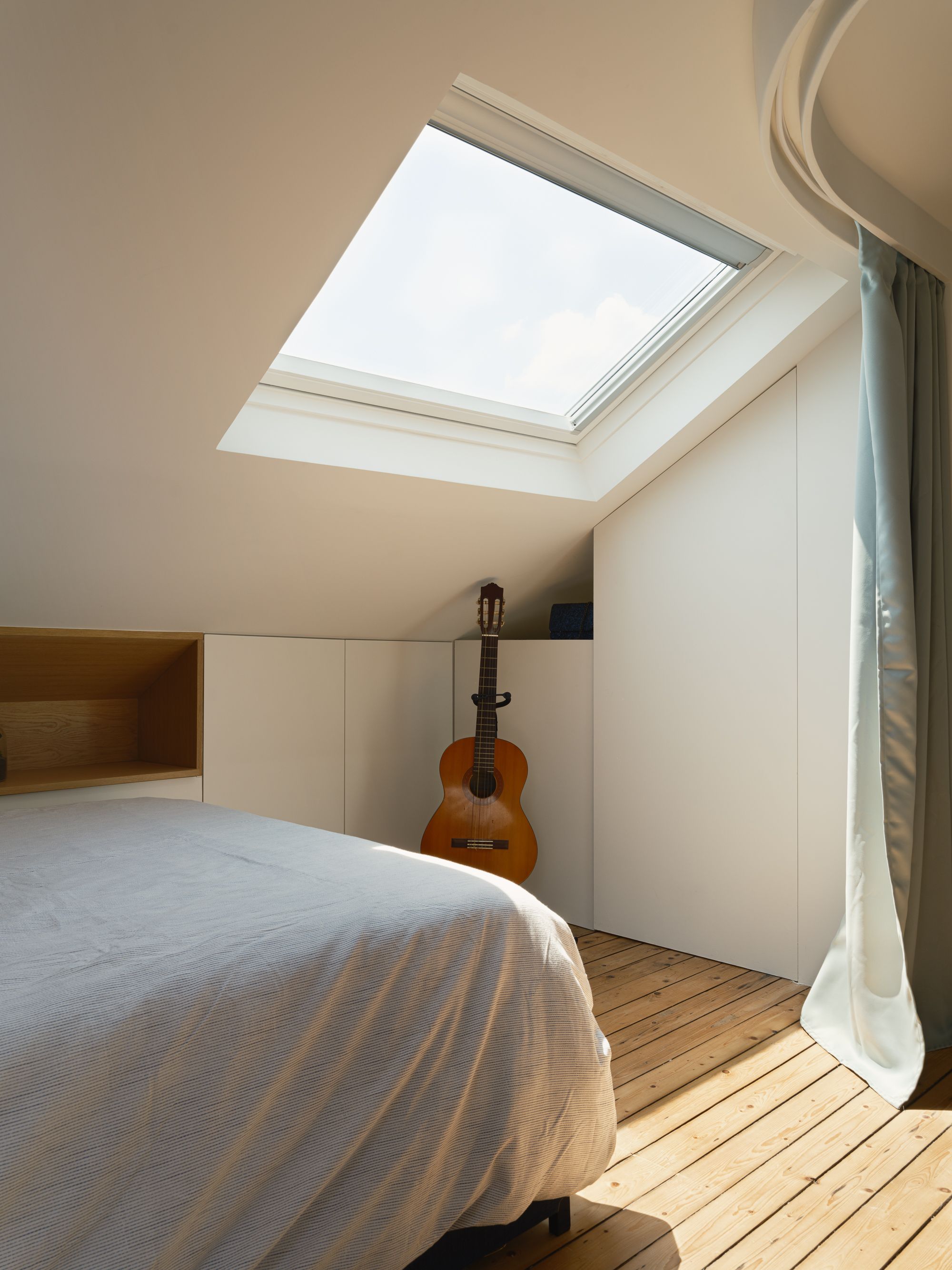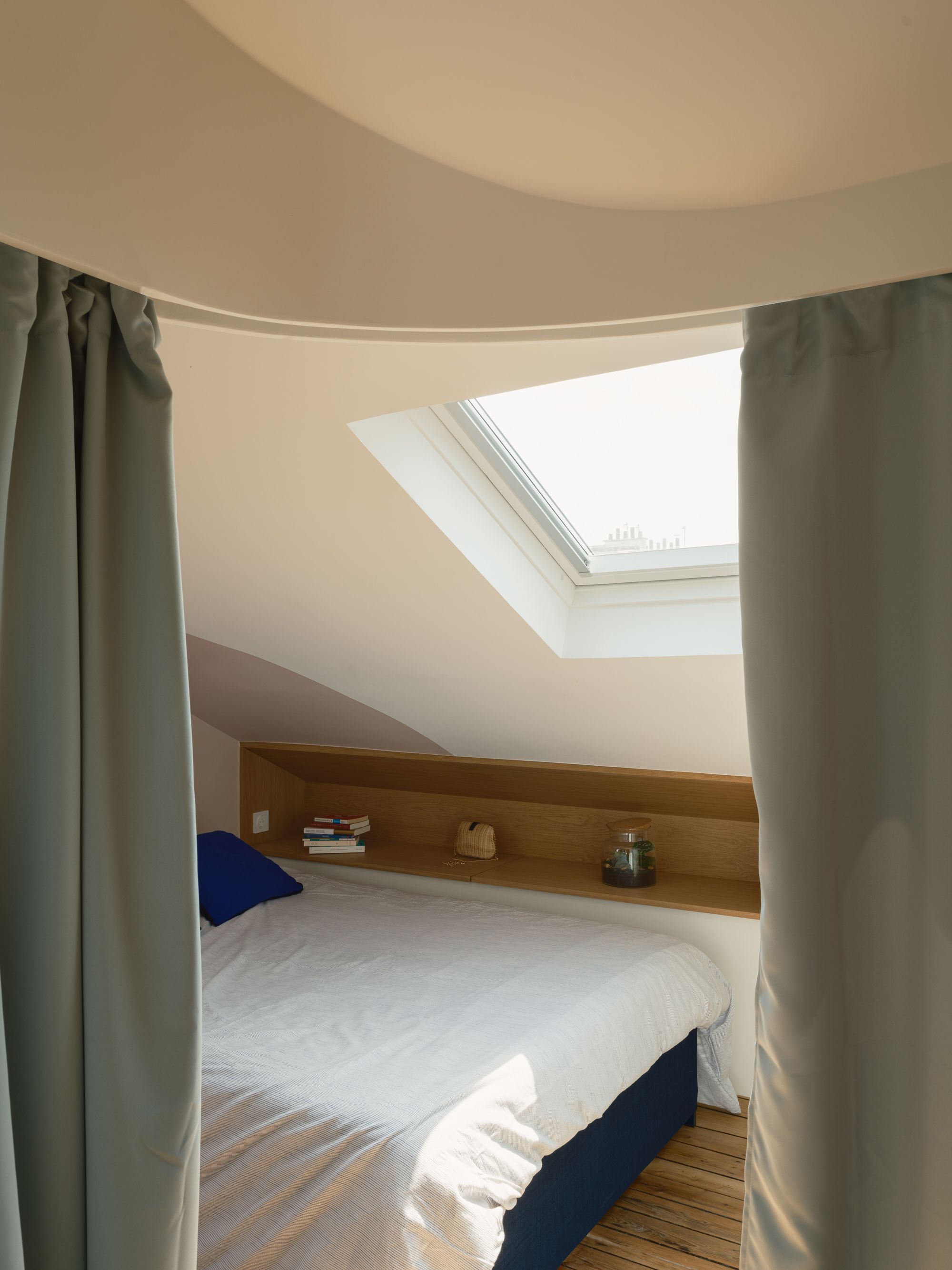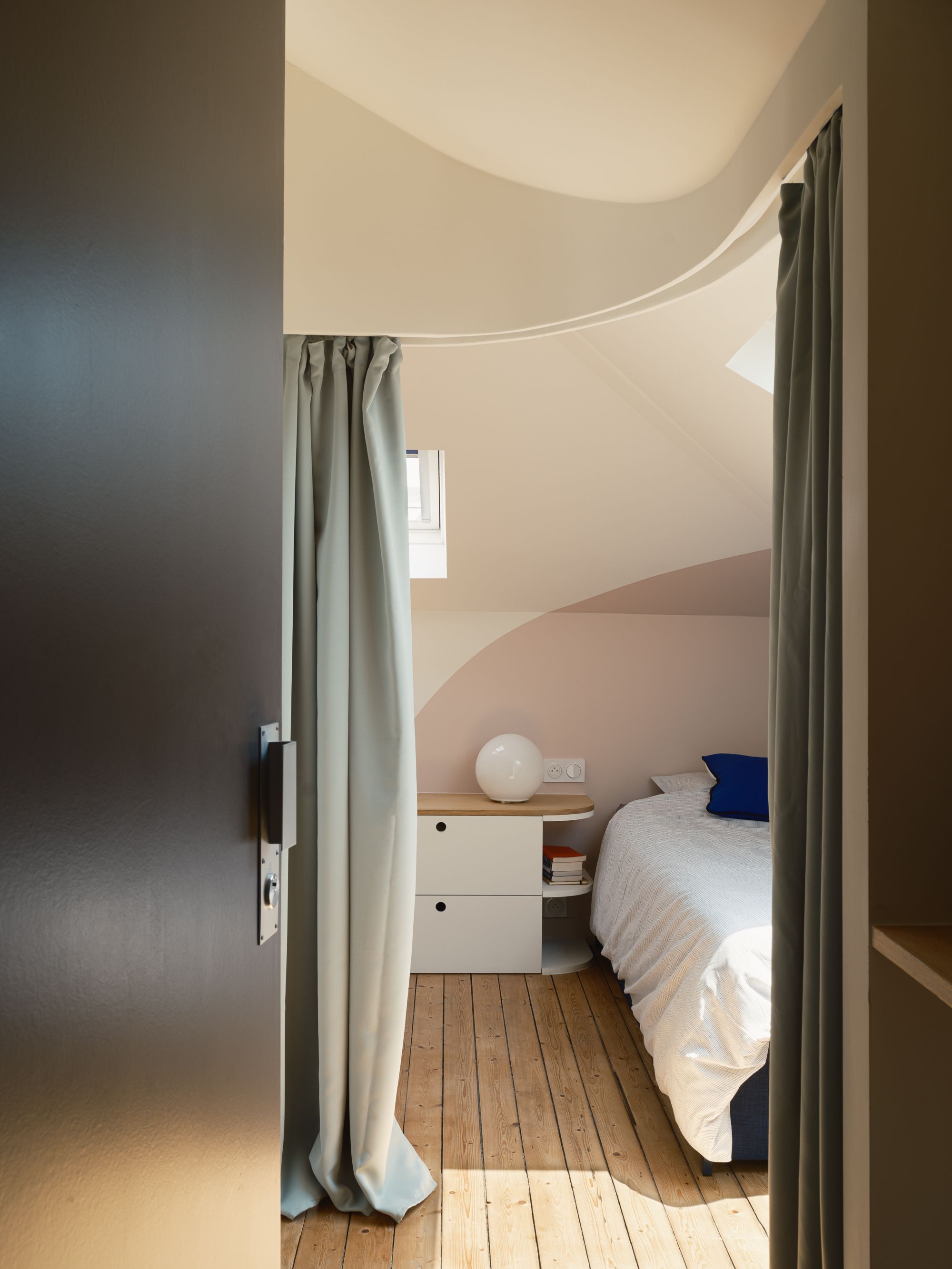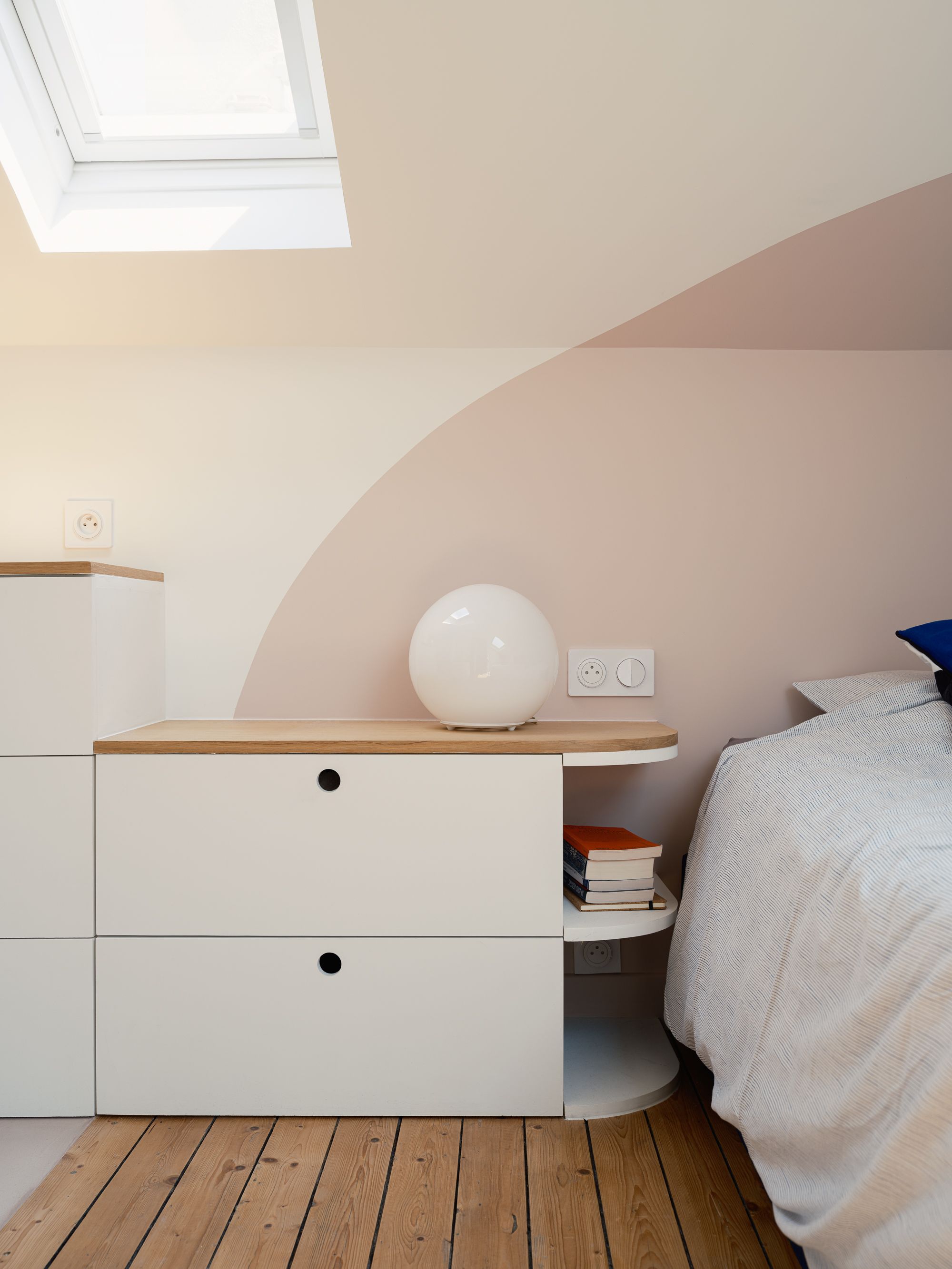 This small 25 m² apartment (32 m² floor area) has been completely redesigned to reveal its cozy charm and beautiful unobstructed rooftop views. The renovation maximized every square meter: creating a bedroom with an en-suite bathroom under the eaves, adding a separate toilet, and transforming the former adjoining rooms into an open-plan living space with a fitted kitchen. All the furniture was custom-designed to fit the space and create a visual unity. The result: a curvaceous interior, blending powder pink, polished concrete, and light wood, for a soft, feminine, and warm atmosphere.