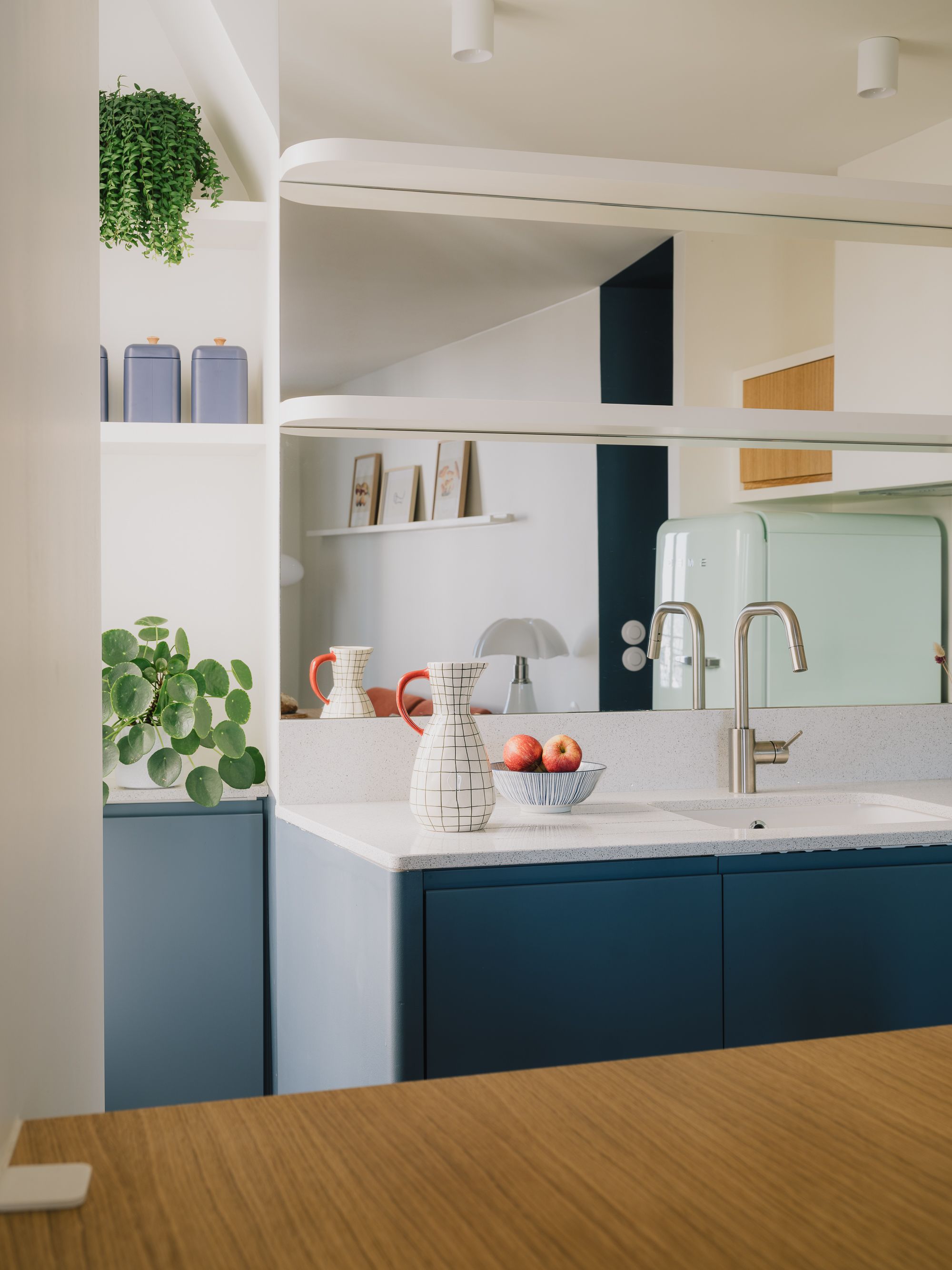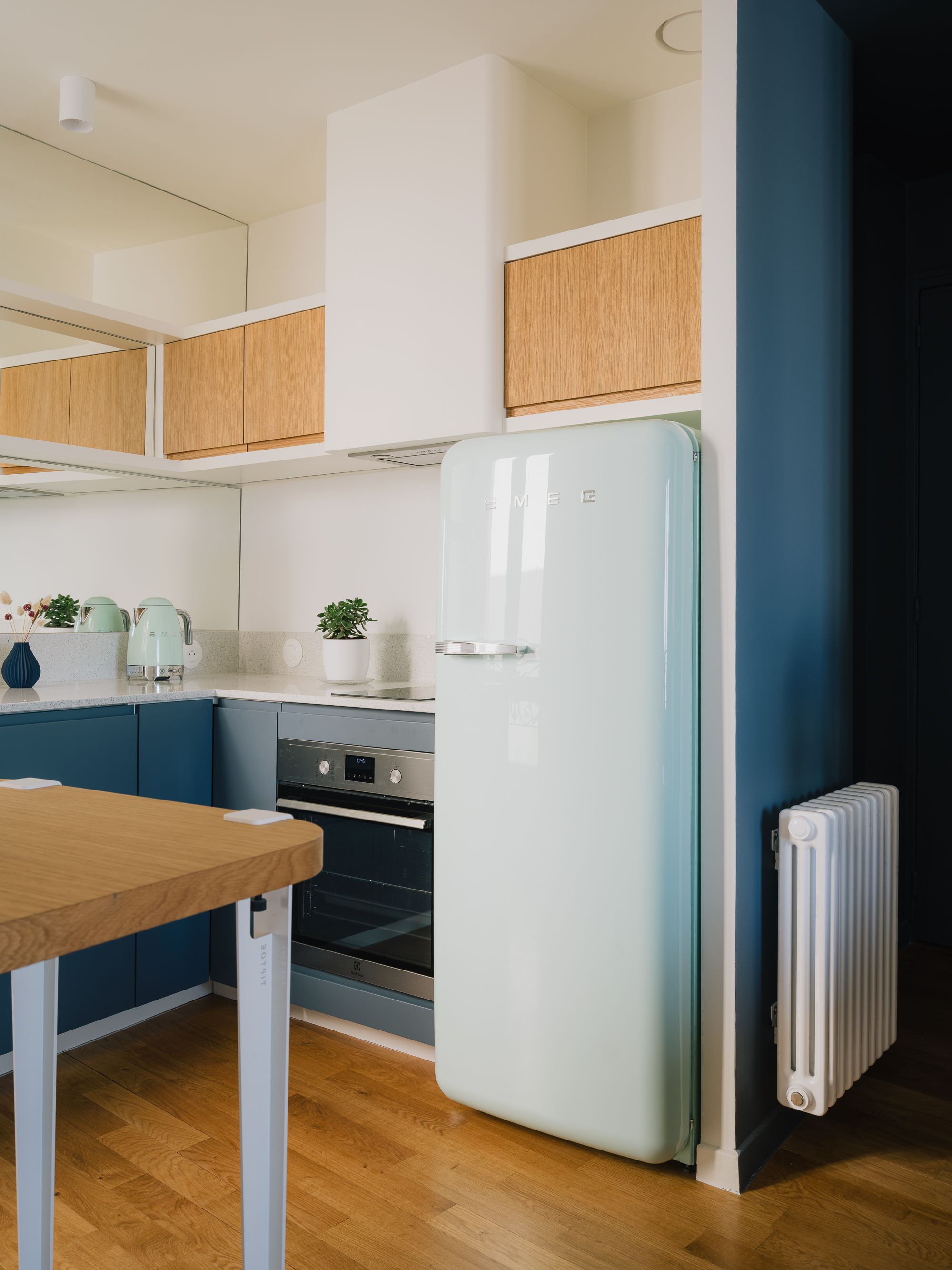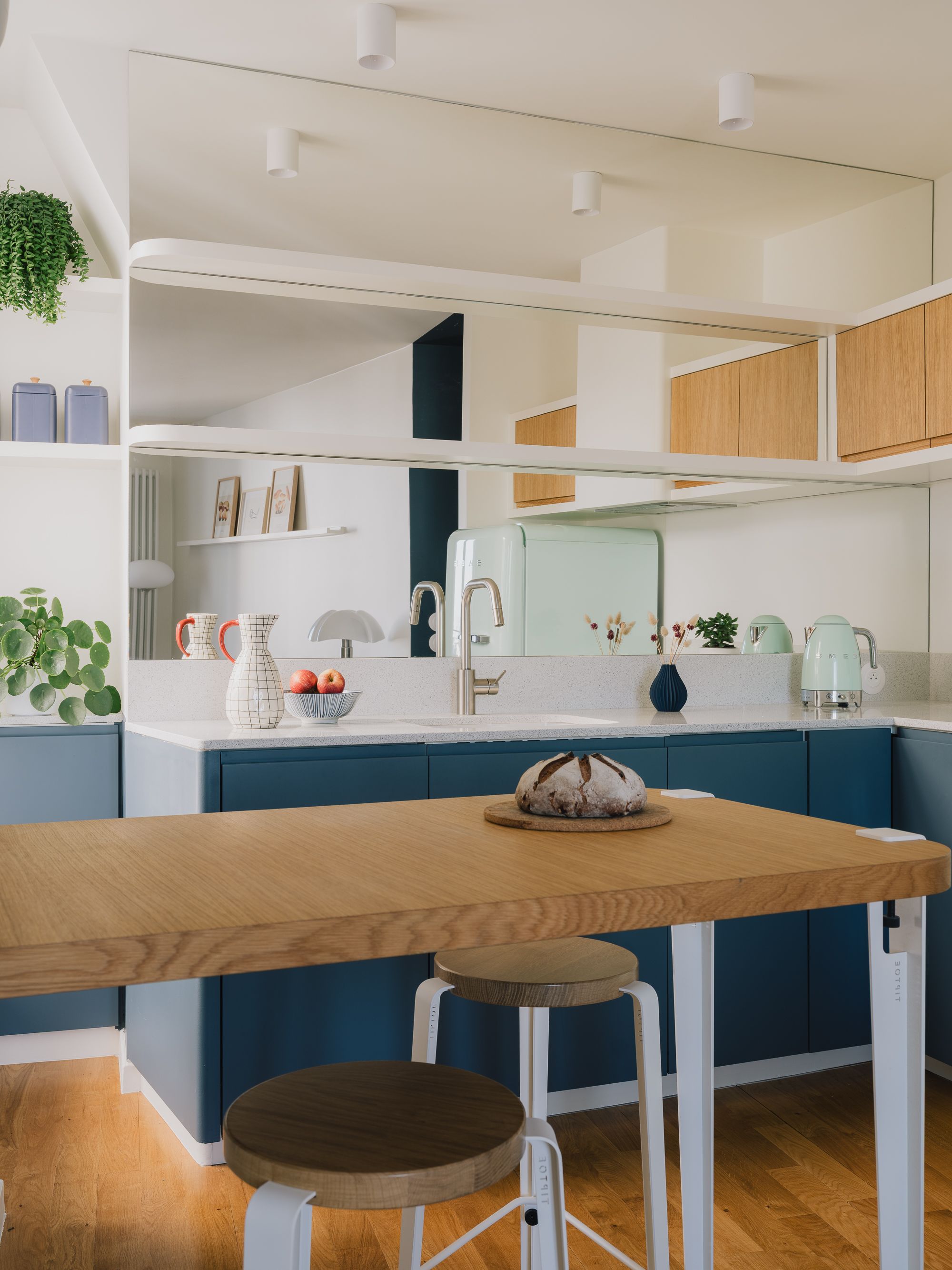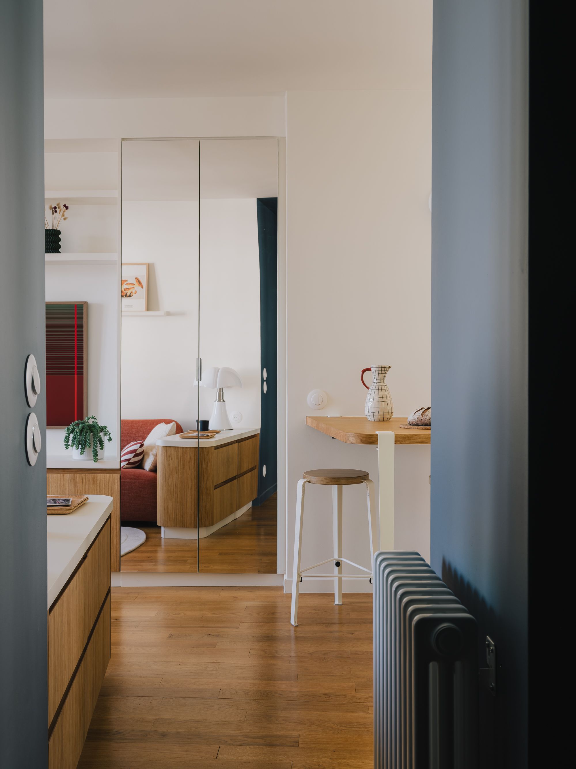 Dans le quartier des Abbesses, cet appartement de 40 m² avec vue imprenable sur la tour Eiffel a été entièrement repensé pour devenir un pied-à-terre lumineux et chaleureux. L’ancien cloisonnement a laissé place à un espace ouvert où le mobilier intégré définit les volumes et fluidifie les circulations. Des miroirs stratégiquement placés amplifient la lumière naturelle et agrandissent visuellement l’espace. Le choix des matériaux et des couleurs mêle différentes nuances de bleu au bois et à des touches plus chaudes, créant une atmosphère cosy et élégante.