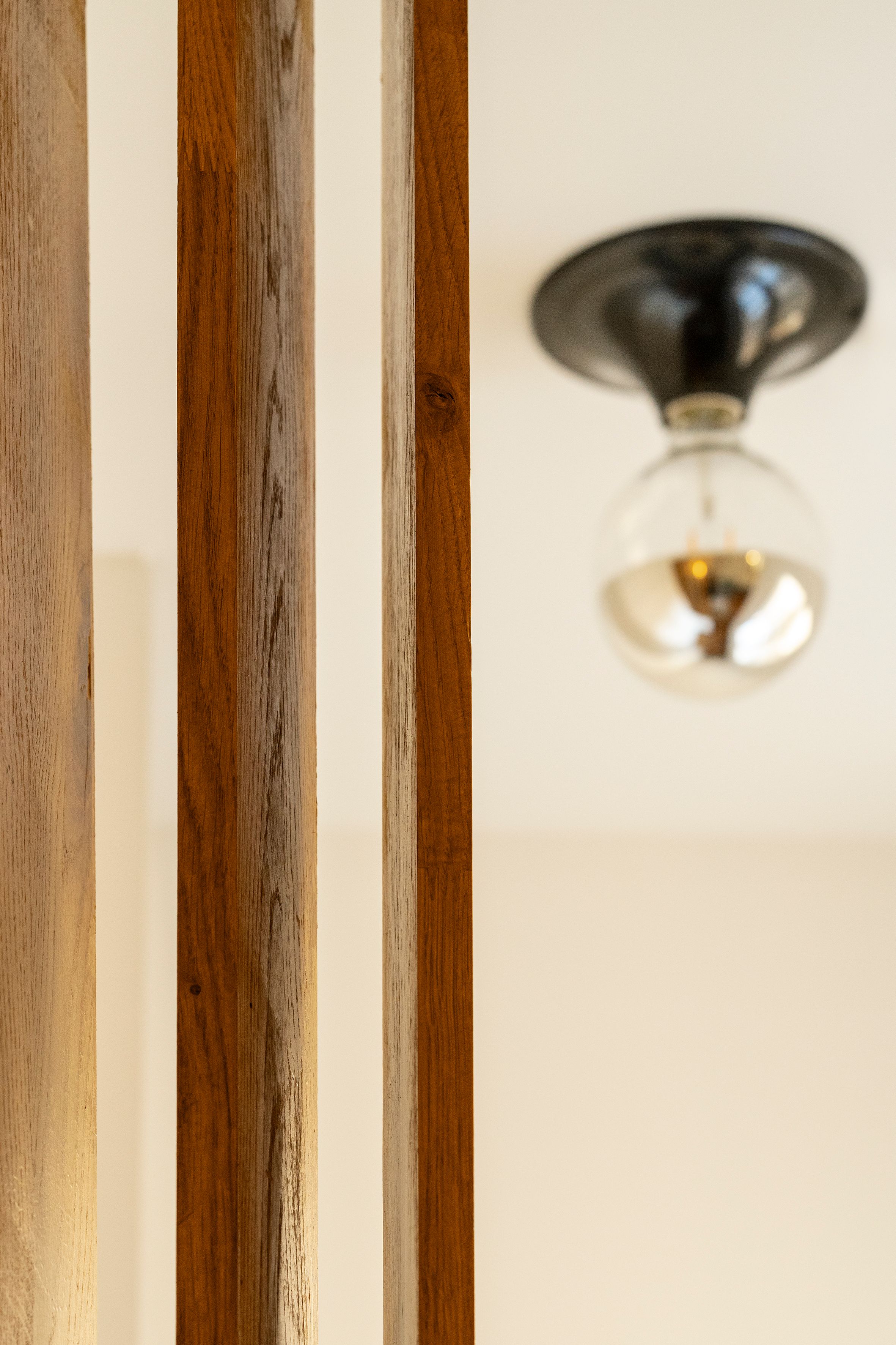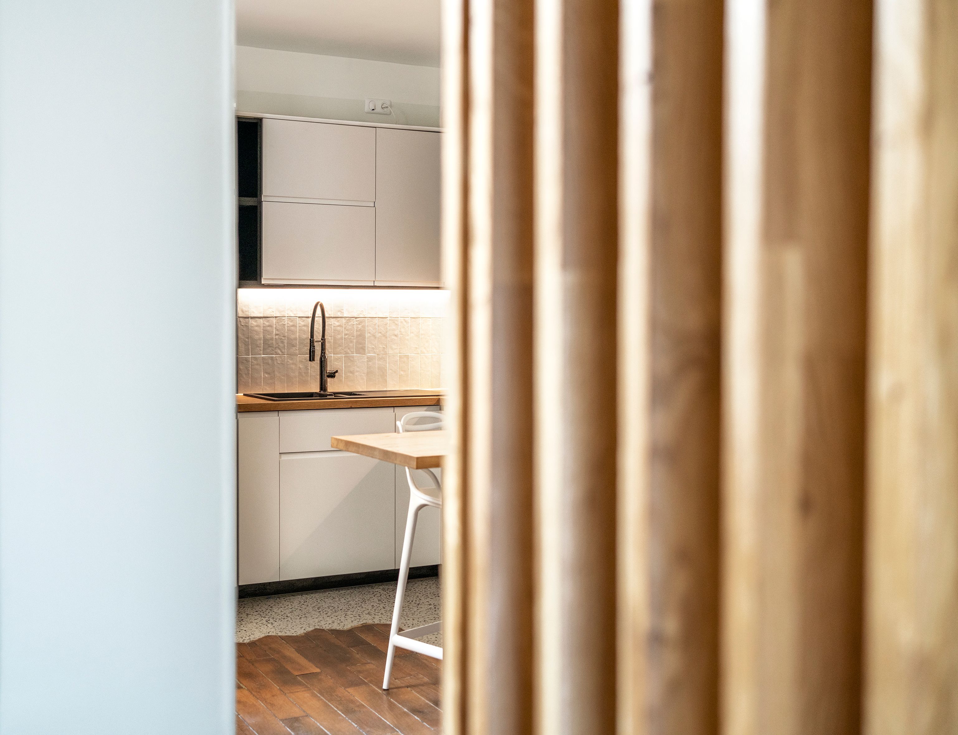 Pour transformer ce petit deux pièces en un appartement fonctionnel destiné à la location, nous avons capitalisé sur son plan circulaire pour créer des espaces fluides et interconnectés. Côté matériaux, un vert pale et du blanc réhaussés de touches de noir et d'or pour une ambiance cocon chic.
